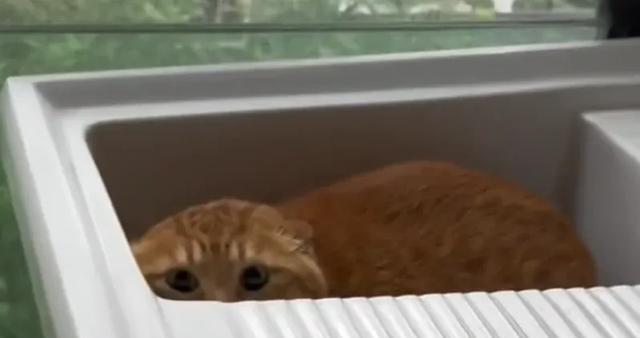 家里来个修灯的师傅,社恐小猫被吓得藏到水池里面,瞪着眼睛,背着耳朵,生怕被人发现。