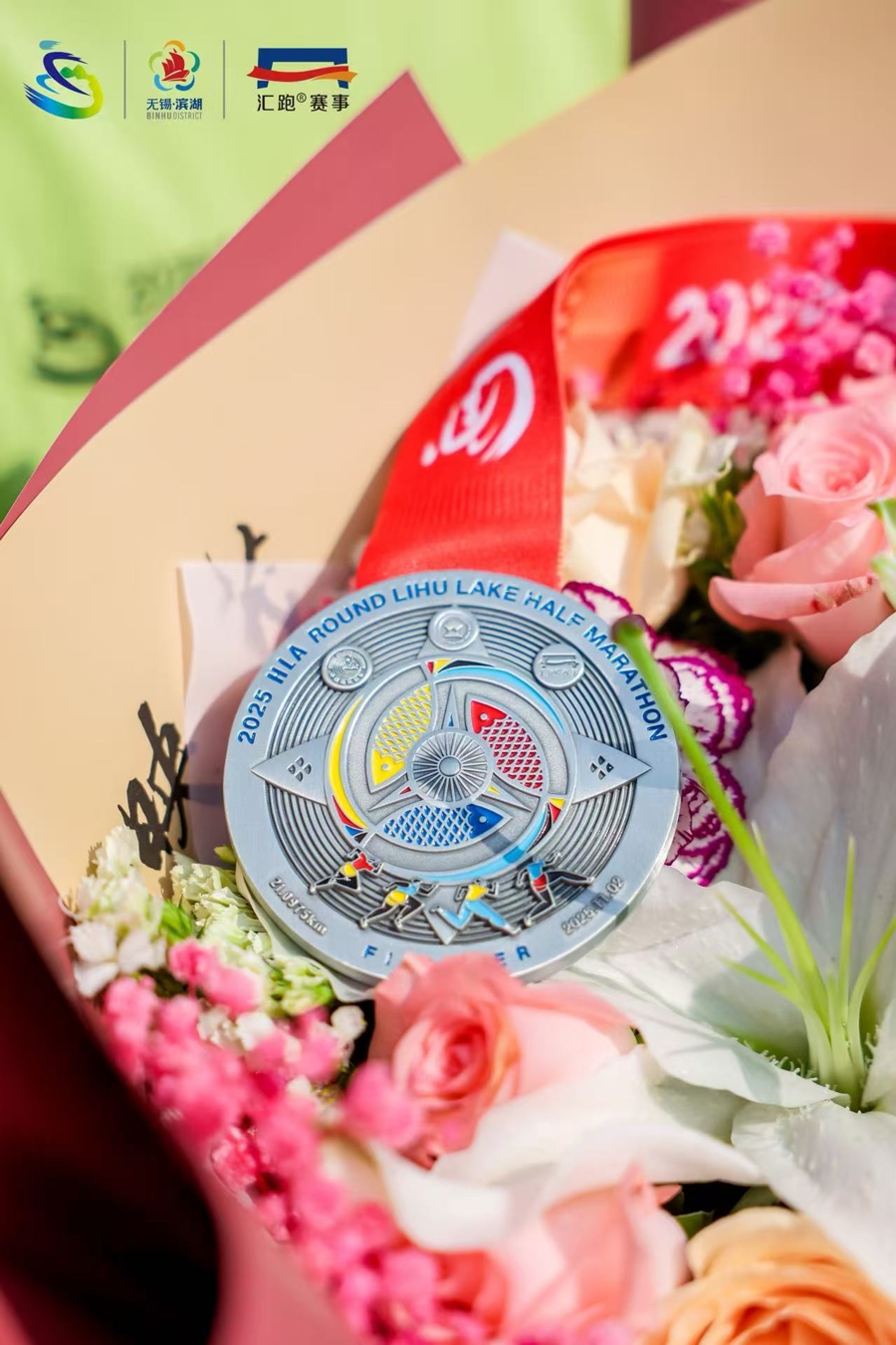 作为世界田联标牌赛事,蠡湖半马始终坚持高标准办赛。丰富的完赛物资将礼遇所有完成挑战的跑者。完赛奖牌尽显江南温婉,镀彩工艺呈现的粼粼波光,似晴空下的水清岸阔,又如夕照中的斑斓光影,奖牌背面,三鱼首尾相衔构成抽象化的循环符号不同形象的跑者在环形跑道上奋力前行,既象征着过去、现在与未来亦隐喻着马拉松运动中不可或缺的耐力、速度和信念。